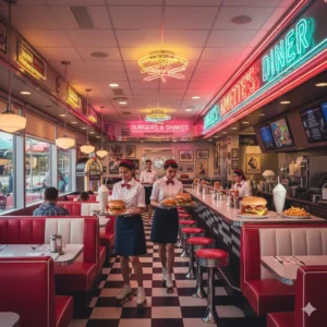 Klassisk 50-tals diner känd för sina stora hamburgare och servitörer på rullskridskor.