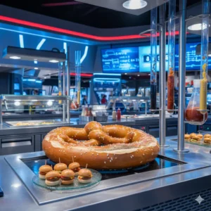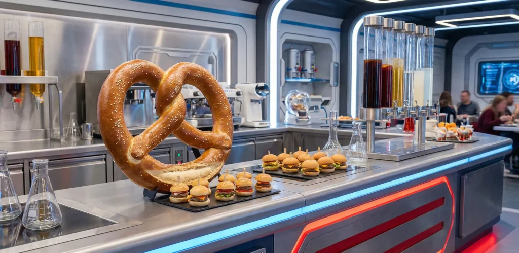 Vår vinnare för 2026! En innovativ Marvel-buffé som leker med matens storlek (gigantiska pretzels och mini-burgare).